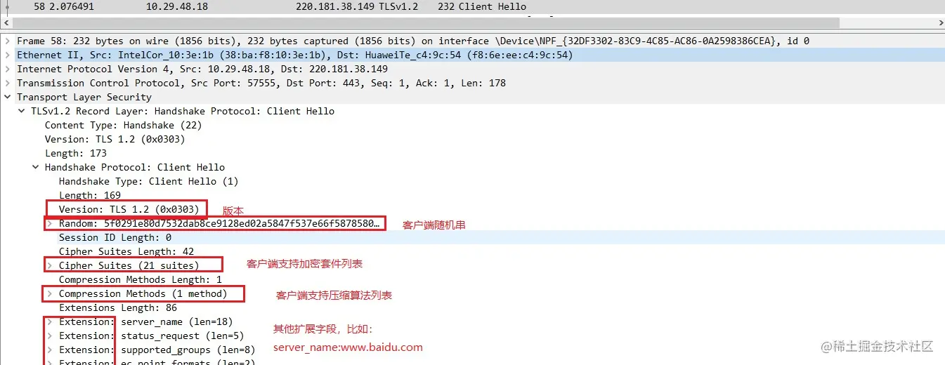 客服端发送自己支持的TLS协议版本、支持的加密套件、支持的压缩方法、以及一个随机数(这是第一个随机数)