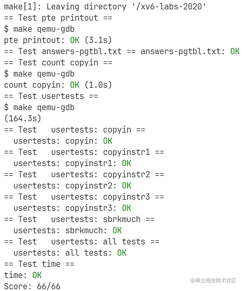 这个 lab3 确实难度不低,首先要对 xv6 的页表机制有一个比较深入的理解,然后 DEBUG 也比较难,我除了用 gdb 调试之外,还用了很多 panic 来尽早的发现是在哪里错了。如果不仔细读 xv6 book 把他理解清除的话大抵是做不出来了吧。