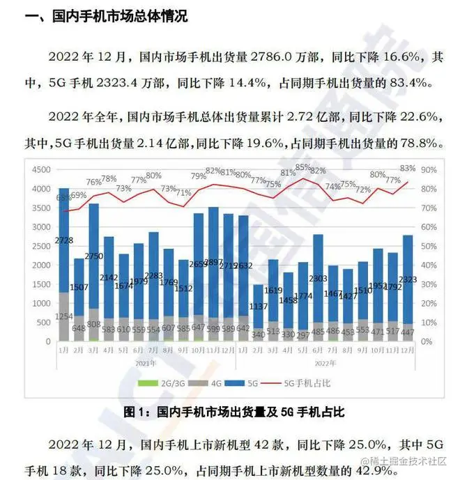 2022 年全年,国内市场手机总体出货量累计 2.72 亿部,同比下降 22.6%。
