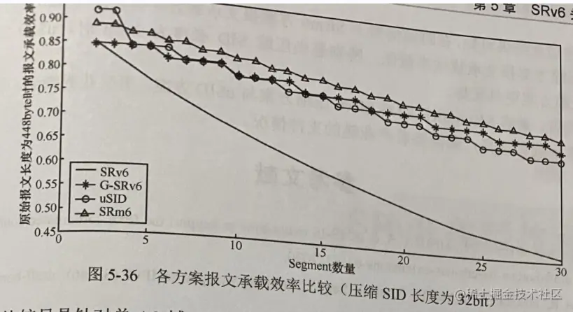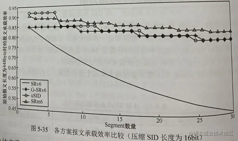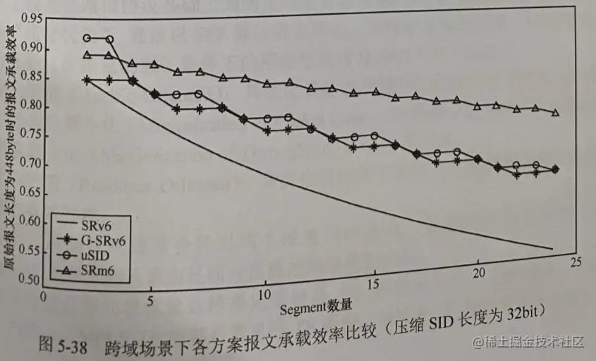 从总体来看,SRm6映射方案的报文承载效率较G-SRv6压缩方案和uSID方案好,这主要是因为SRm6方案无须携带公共前缀Block,且使用了更简化的CRH报头格式。