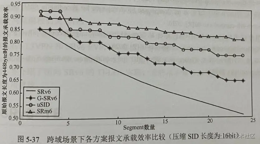 由上述仿真结果可知,在跨域场景下SRm6方案报文承载效率仍然最高,uSID方案次之,G-SRv6压缩方案报文承载效率最低。特别是当压缩SID长度为16bit时,uSID方案相对G-SRv6压缩方案更具优势。