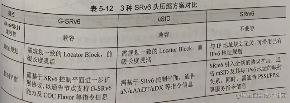 G-SRv6、uSID及SRm6头压缩方案在技术实现上各具优势,3种SRv6头压缩方案对比见表5-12。
