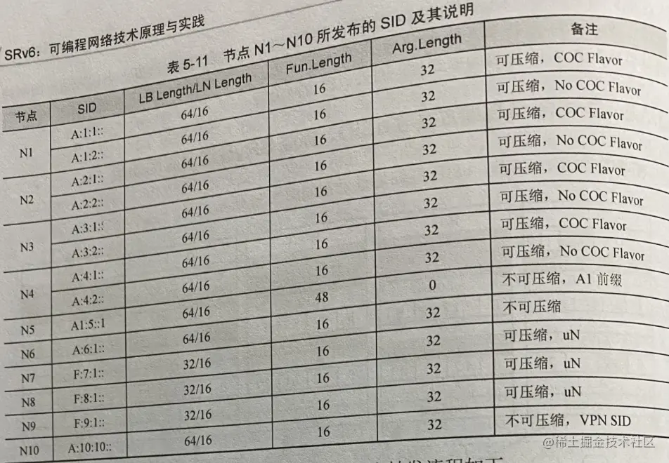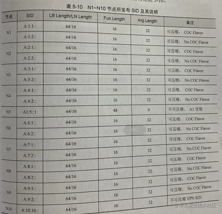 每个SRH压缩节点在发布SID信息时还需携带SID Structure Sub-sub-TLV标识相应SID Container各字段长度。此处假定各G-SRv6节点所发布Common Prefix长度为64bit,G-SID长度为32bit,Argument长度为32bit;假定uSID Block为32bit,uSID长度为32bit。节点N1~N10所发布的SID及其说明见表5-11。