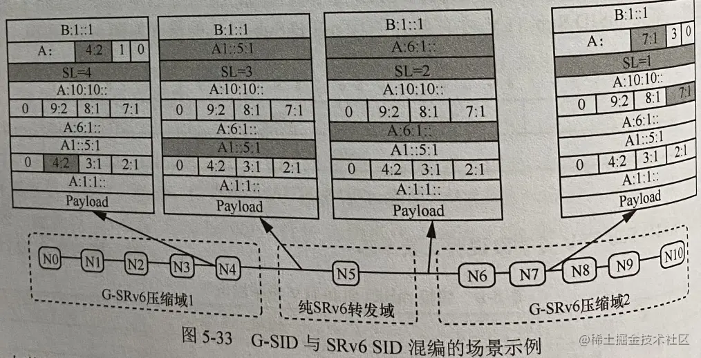 图5-34中,节点N0 ~ N4属于G-SRv6压缩域,节点N5属于纯SRv6转发域,节点N6 ~ N10属于uSID压缩域。节点N5不具备SRH压缩能力,简称普通SRv6节点。