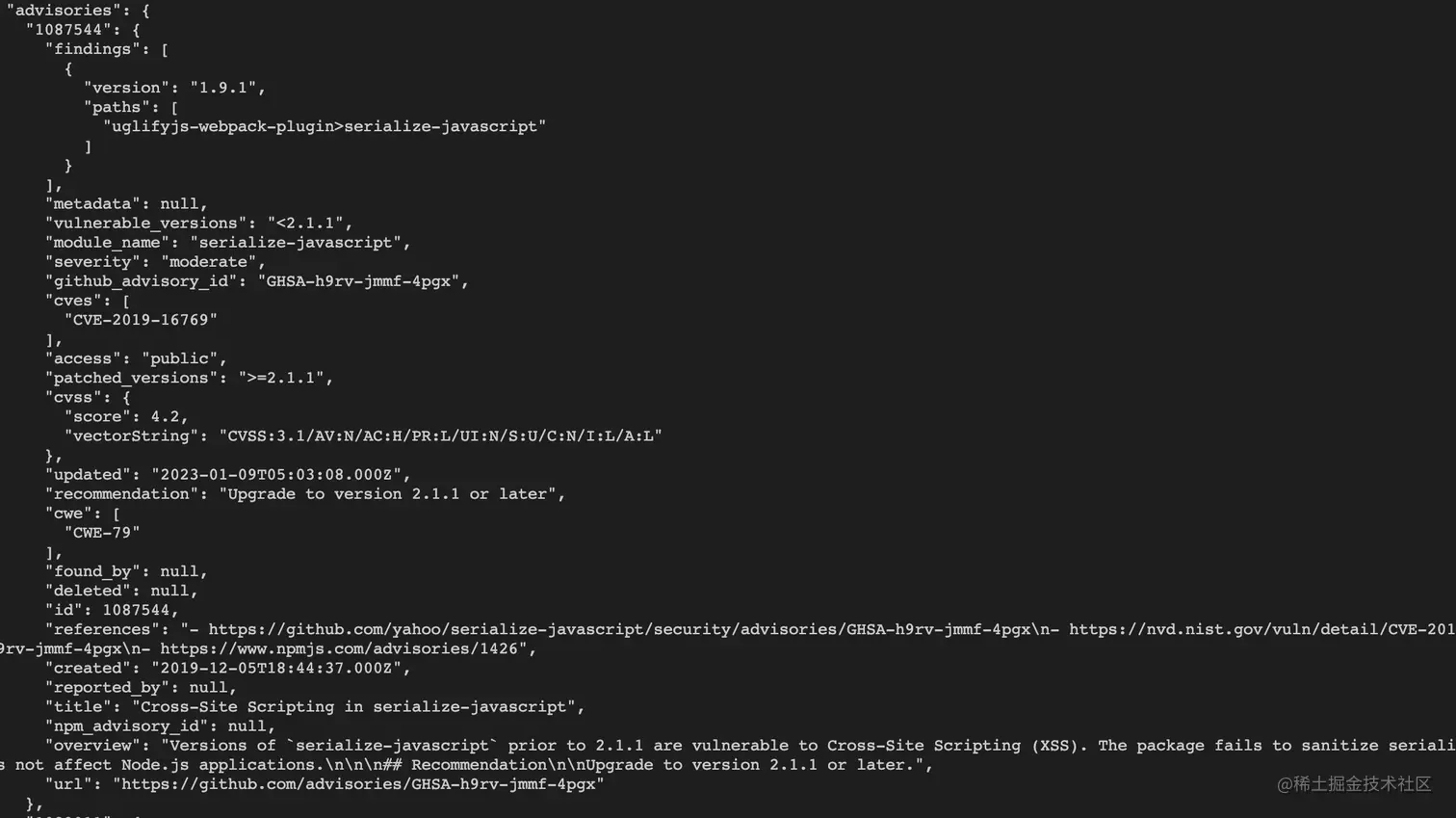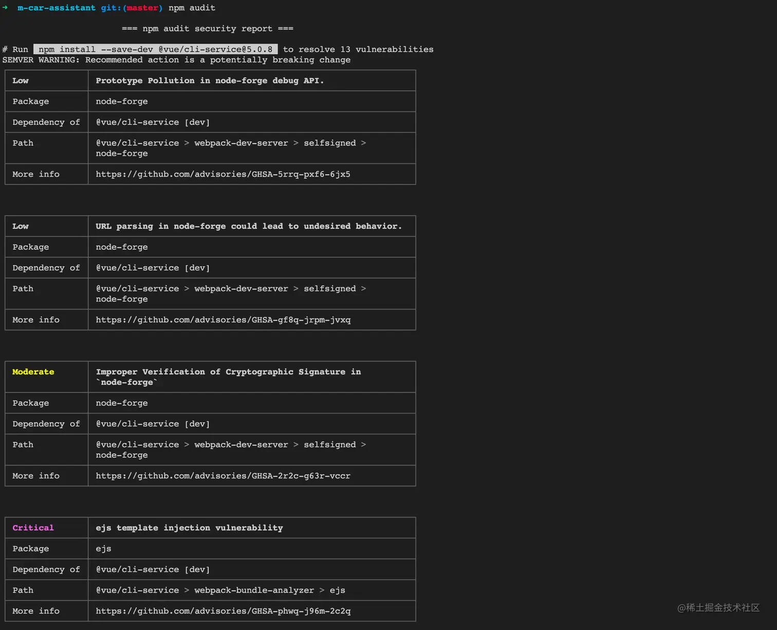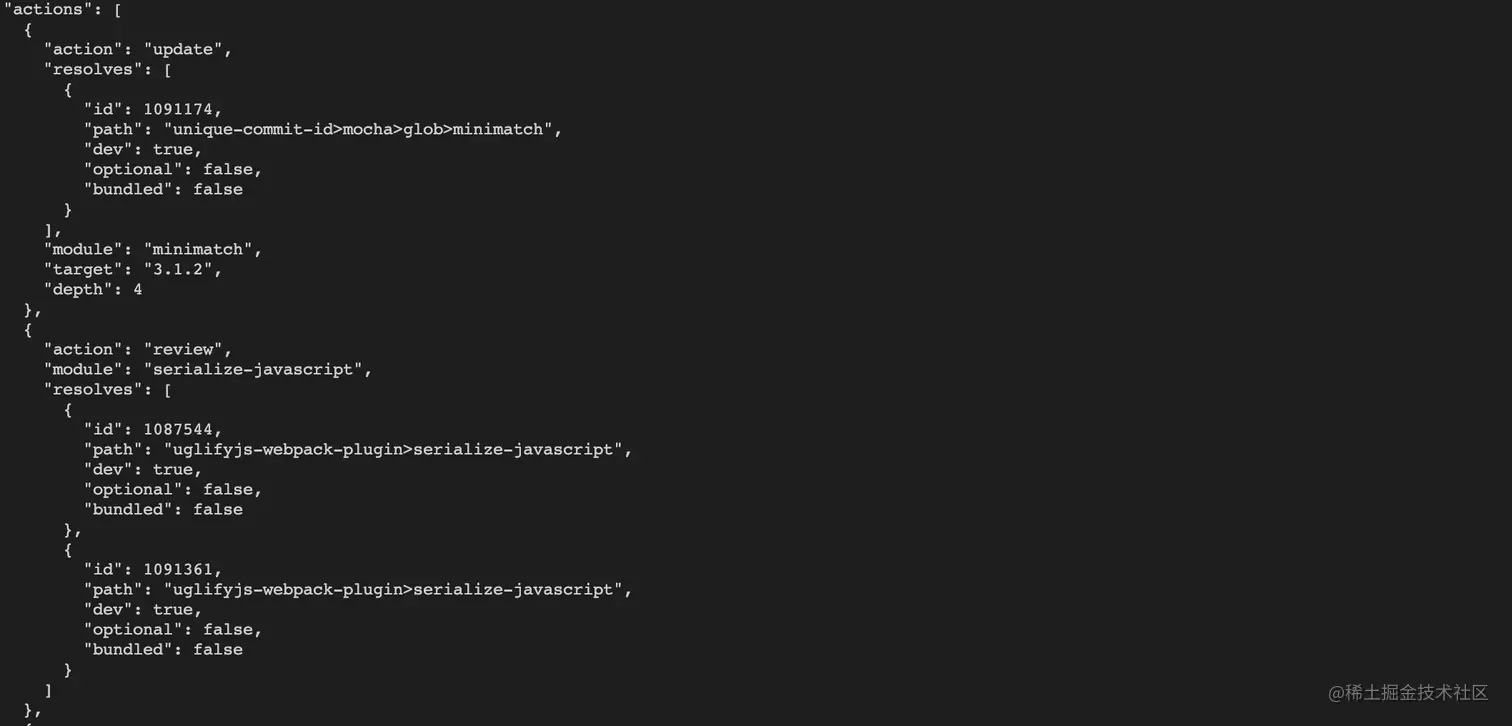 npm audit --json 打印出一个详细的json格式的安全报告,里面有漏洞的详情和修复策略