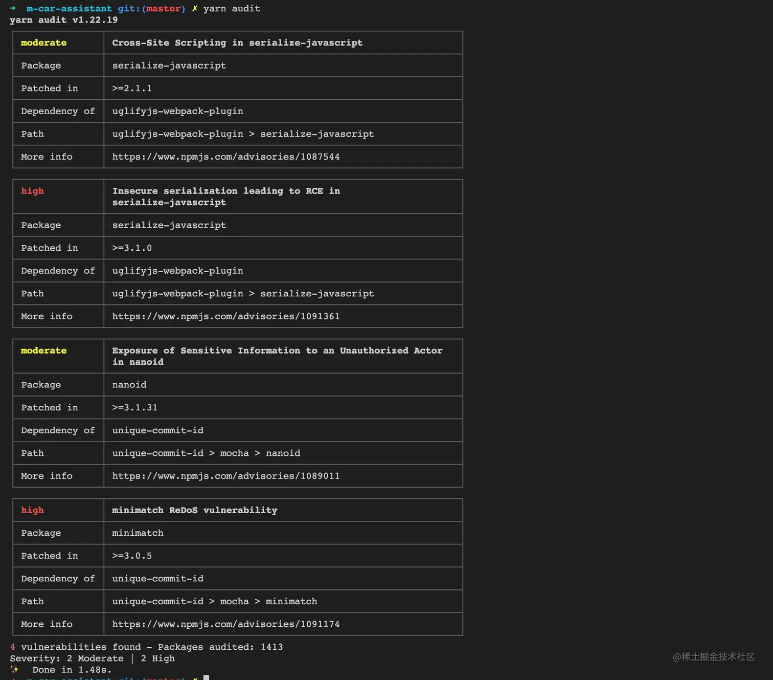 大家拿到项目之后执行npm install,之后将项目运行起来,几乎没人关注安装了什么。安全问题不容忽视,接下来介绍的几个扫描工具能快速帮你识别项目中的依赖有哪些漏洞。比较常用的扫描工具有npm audit、yarn audit、snyk等。