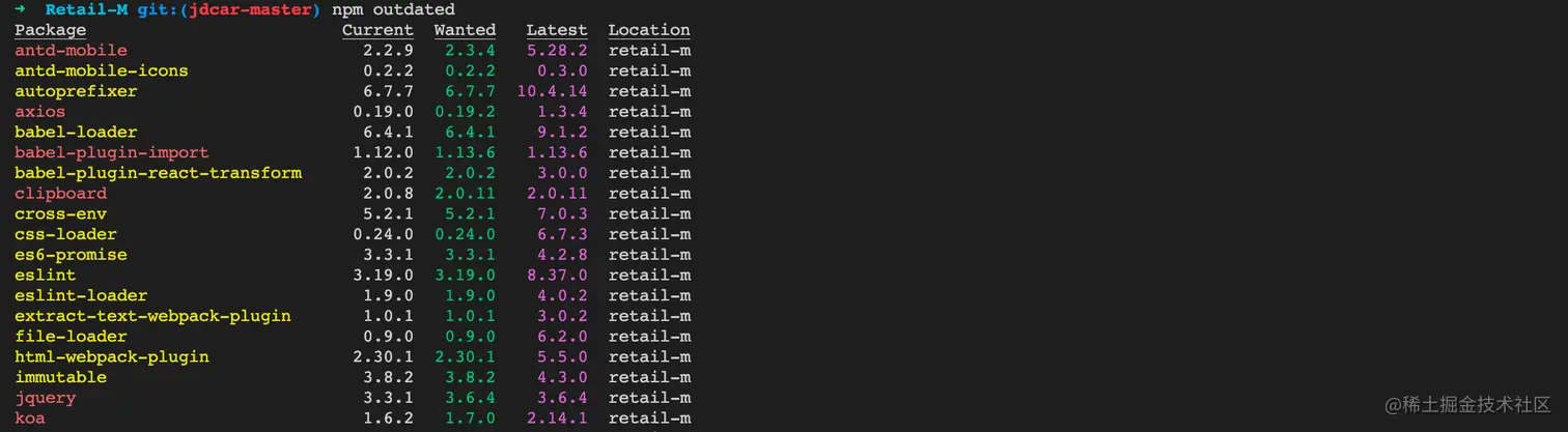 盲目升级包版本不可取,但是当包版本过时不去升级也会带来一系列问题。npm outdated命令可以查看哪些包已经过期了。其中黄色的依赖包对应package.json中指定的版本,红色的依赖包表示有可用的更新。