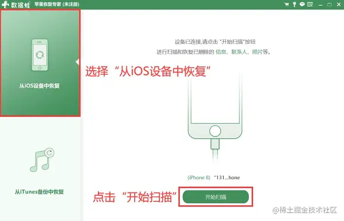 第3步:如果你没有备份iPhone的通话记录,可以直接选择**【从iOS设备恢复】,并【开始扫描】**;