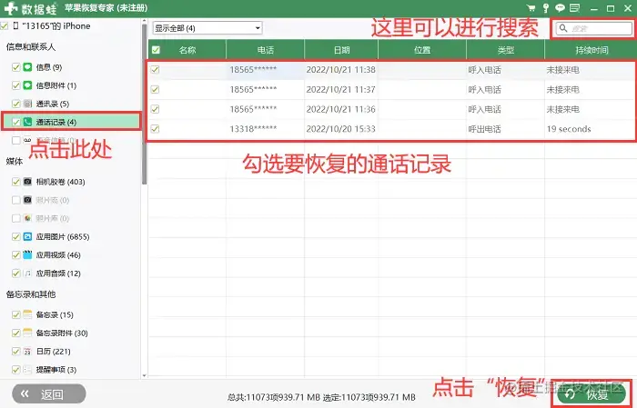 第4步:可以点击**【通话记录】找到要恢复的数据,也可以直接在【搜索框】**进行精准查找;