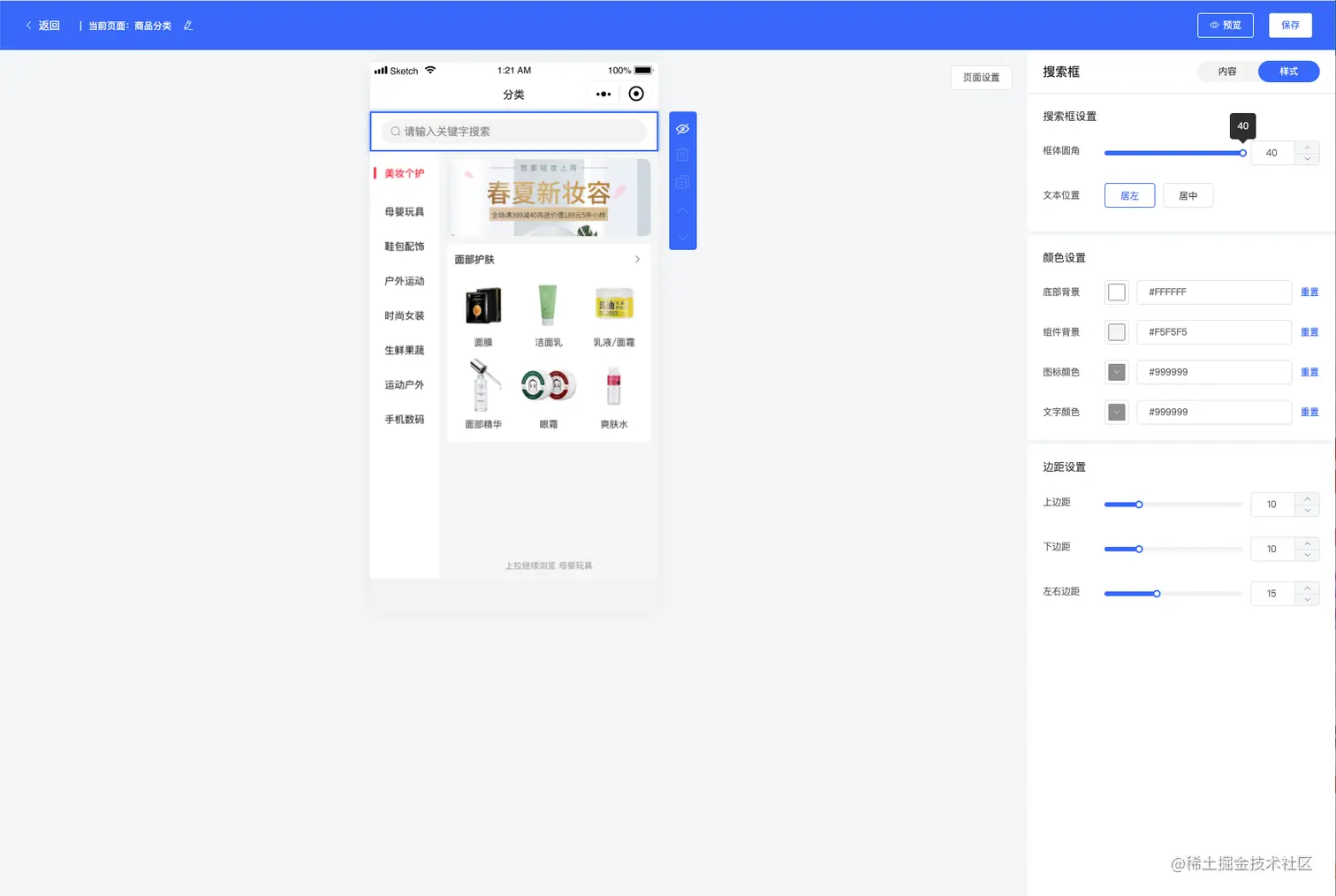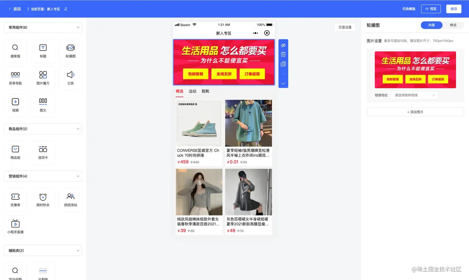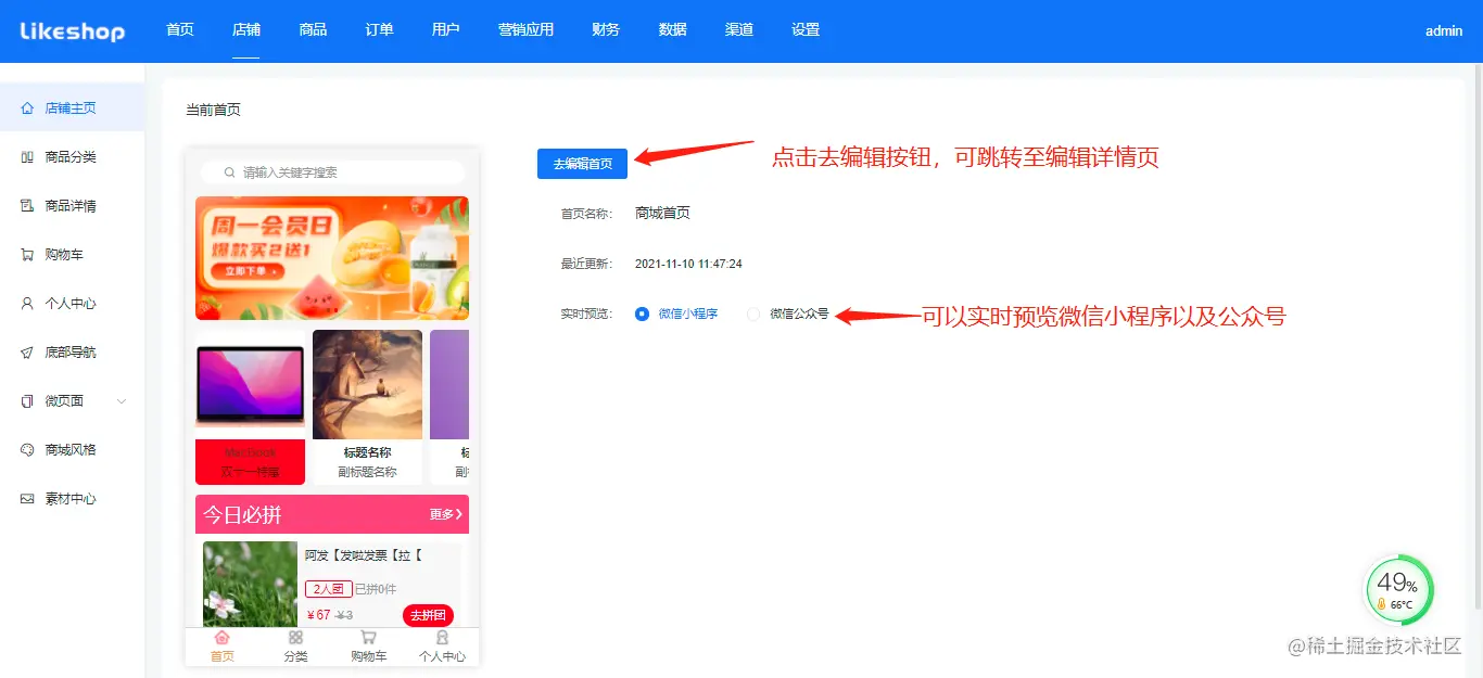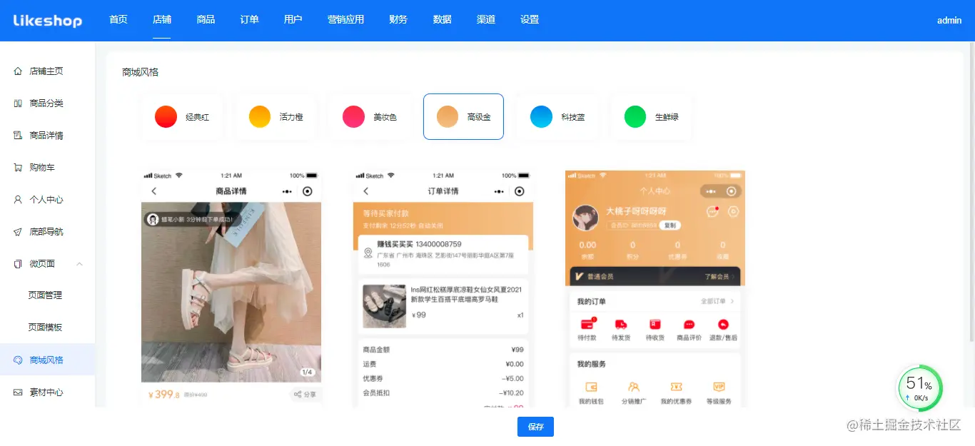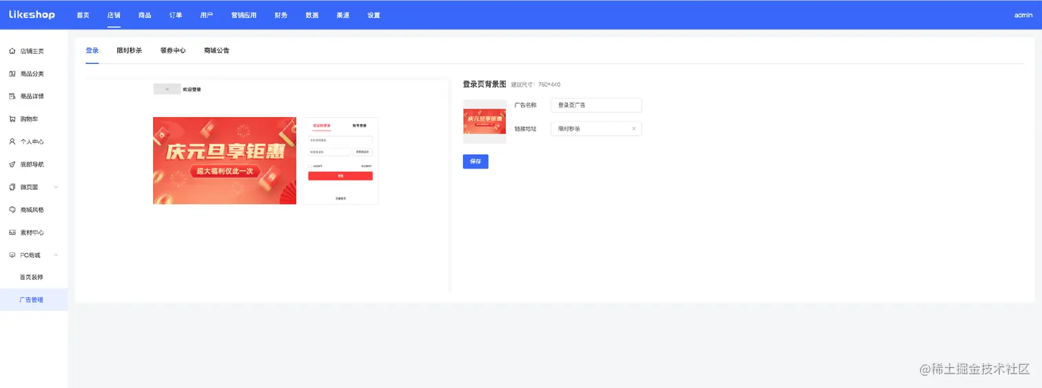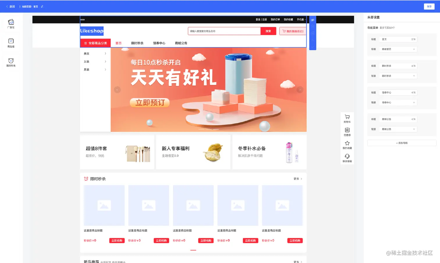 前后端分离管理后台融合最新的设计思路,支持可视化拖拉拽DIY界面,可以保存为多模板,随时选用,全商城页面可视化配置,节日运营装修不再是难事,多种商城风格可选择,无论是生鲜,美妆,电商等各类行业,总有风格适合。