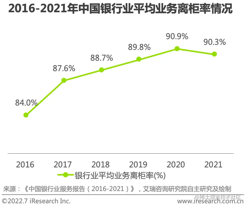 根据艾瑞关于2022年中国手机银行 App 的研究分析显示,自2016年起,银行业平均业务离柜率呈上升趋势,2021年已有超90%的银行业务实现离柜办理,截止到2022年6月,我国手机银行 App 的月活总数已达到5.7亿台,用户规模增长明显。但与此同时,银行线下网点数量也在逐年减少,以国有六大行为例,自2016年至2021年,国有六大行线下营业网点数量减少了3000多家。