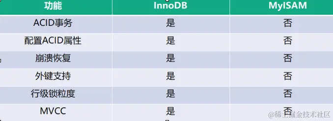 InnoDB 支持 ACID 的事务 4 个特性,而 MyISAM 不支持;