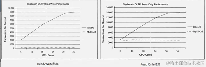 C. 只读模式下,随着 CPU 核数的增加,InnoDB 的读写能力呈线性增长,最高可达近 14000 的 TPS,但 MyISAM 的处理能力不到 3000 TPS。