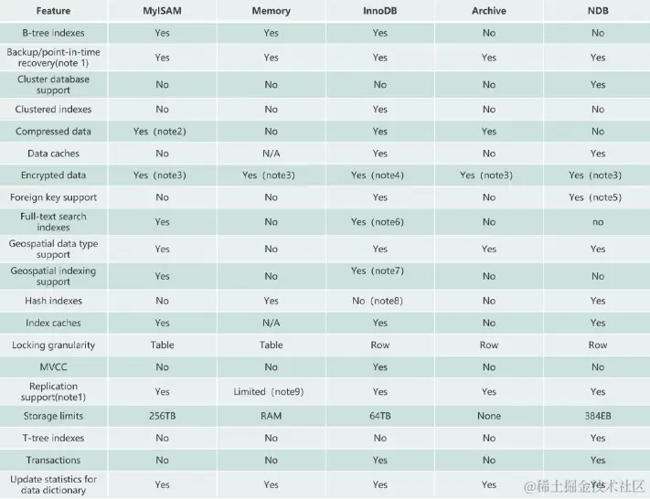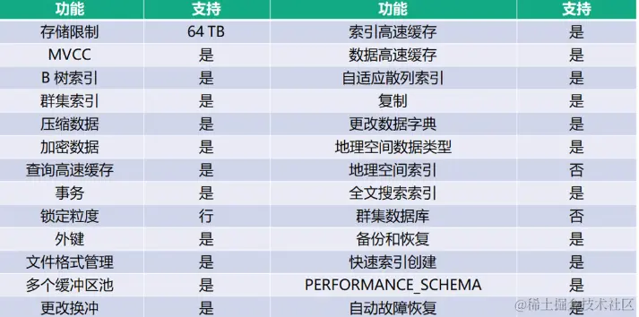 InnoDB 表最大还可以支持 64TB,支持聚簇索引、支持压缩数据存储,支持数据加密,支持查询/索引/数据高速缓存,支持自适应 hash 索引、空间索引,支持热备份和恢复等,如下图所示。