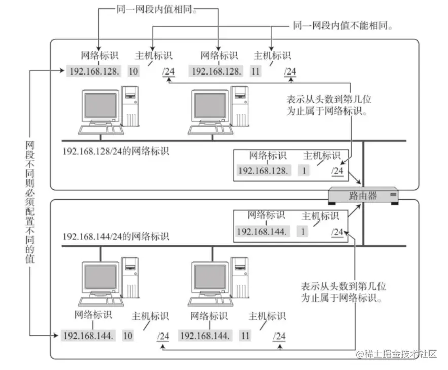 192.168.128.10/24中的“/24”表示从第1位开始到多少位属于网络标识。在这个例子中,192.168.128之前的都是该IP的网络地址。