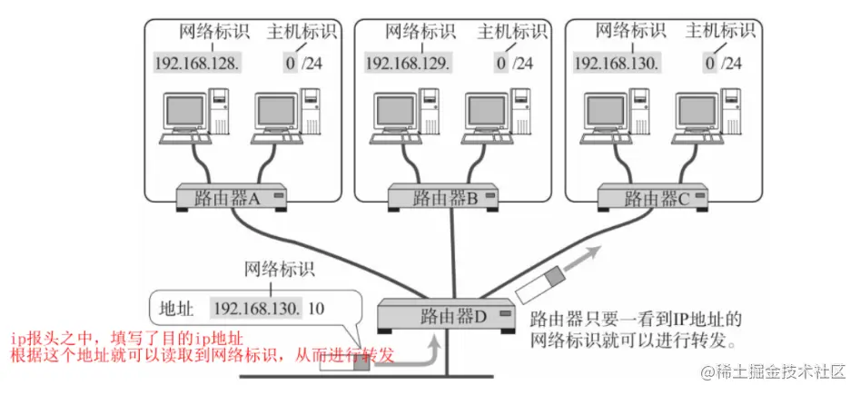 IP包被转发到途中某个路由器时,正是利用目标IP地址的网络标识进行路由。因为即使不看主机标识,只要一见到网络标识就能判断出是否为该网段内的主机。