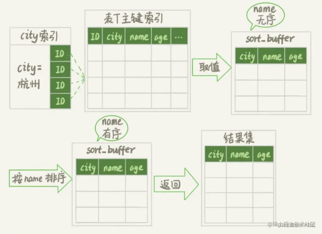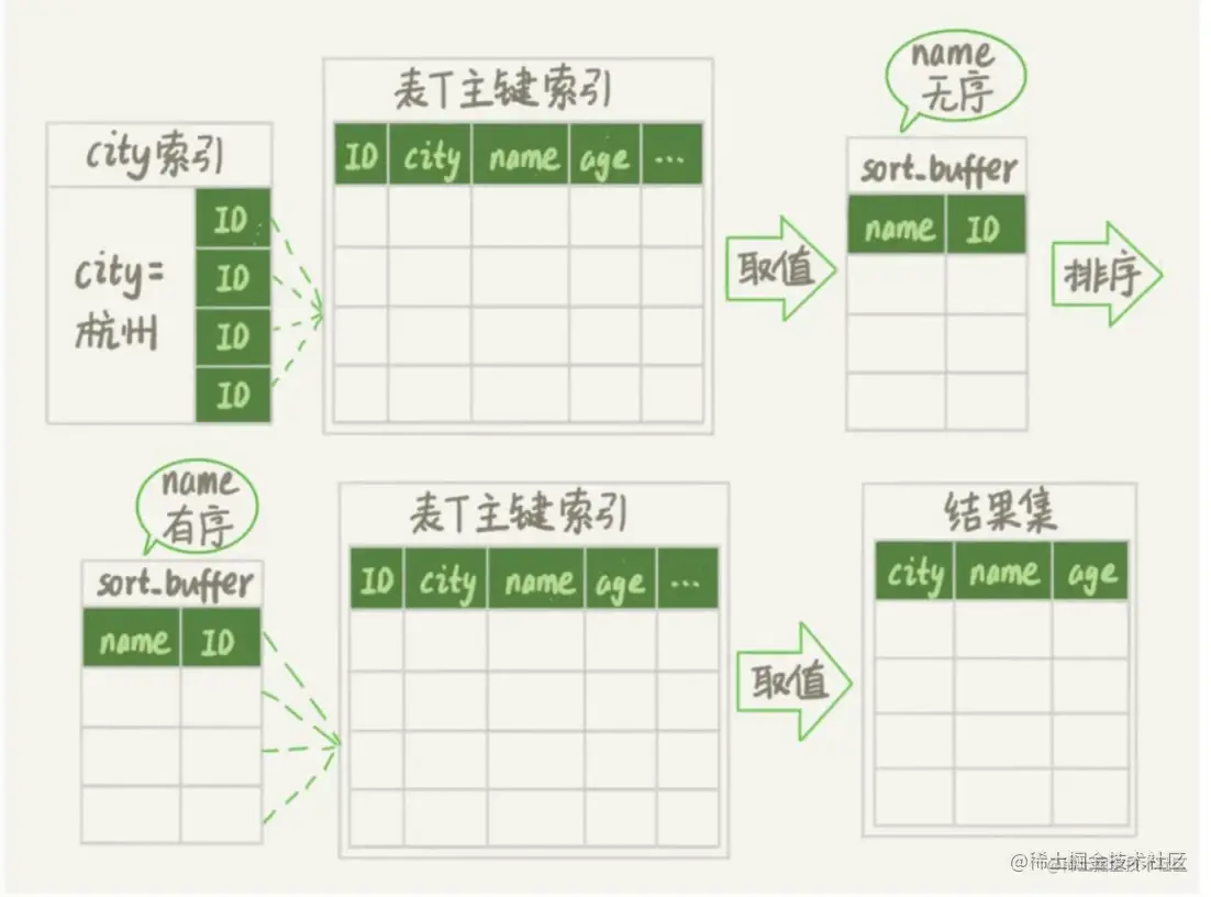 假设 name、city、age 这 3 个字段定义的总长度为 36,而 max_length_for_sort_data = 16,就是单行的长度超了,MySQL 认为单行太大,需要换一个算法。此时,放入 sort_buffer 的字段就会只有要排序的字段 name 和主键 id,那么排序的结果中就少了 city 和 age,需要回表了。