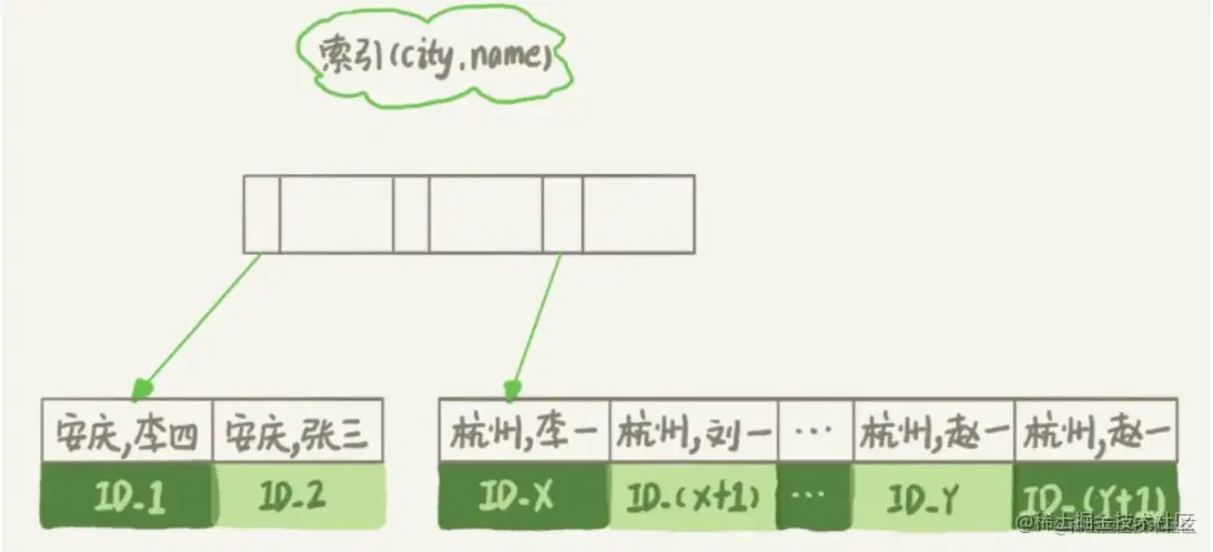 - 从索引 (city,name) 找到第一个满足 city='杭州’条件的主键 id;