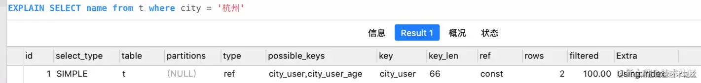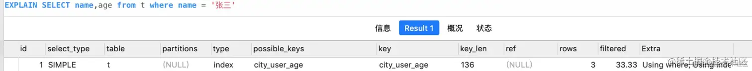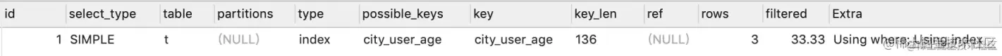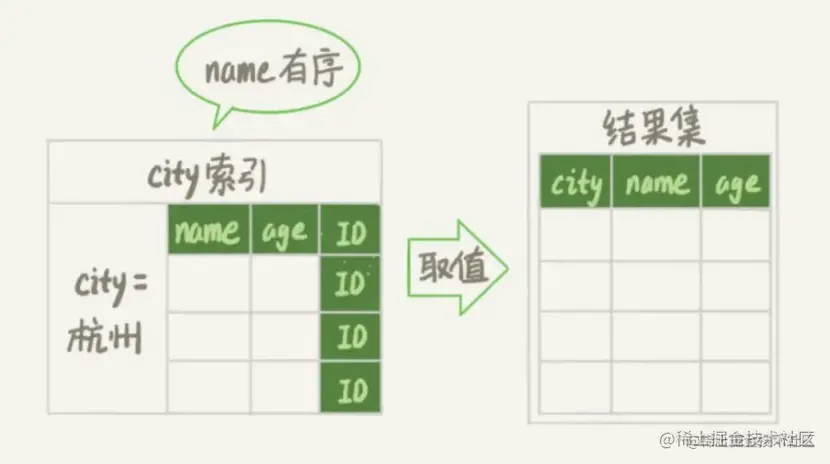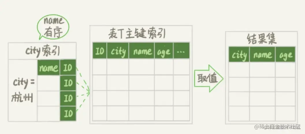 - 到主键 id 索引取出整行,取 name、city、age 三个字段的值,作为结果集的一部分直接返回;
