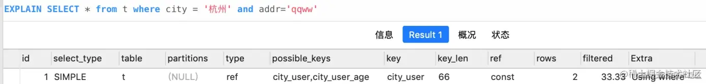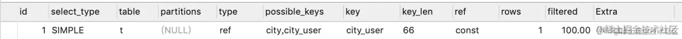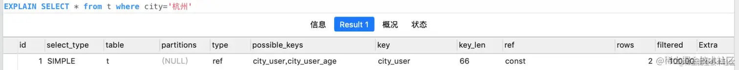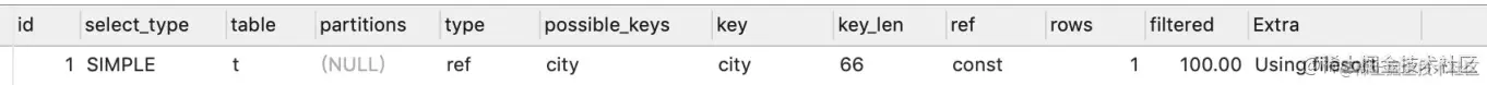 CREATE TABLE `t` ( `id` INT ( 11 ) NOT NULL, `city` VARCHAR ( 16 ) NOT NULL, `name` VARCHAR ( 16 ) NOT NULL, `age` INT ( 11 ) NOT NULL, `addr` VARCHAR ( 128 ) DEFAULT NULL, PRIMARY KEY ( `id` ), KEY `city` ( city ) ) ENGINE = INNODB