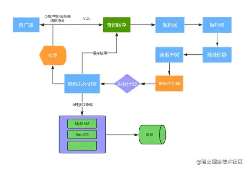 - 查询语句执行流程如下: 权限校验(如果命中缓存)–> 查询缓存 —> 分析器 --> 优化器 —> 权限校验 —> 执行器 —> 引擎