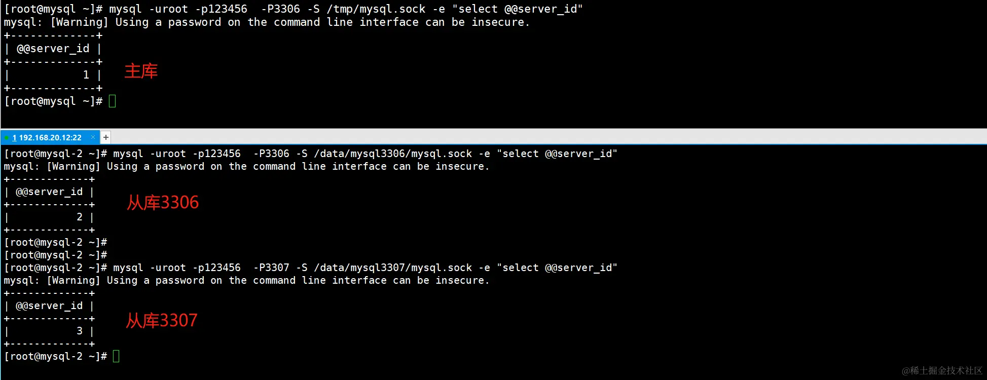 MySQL 多个节点已经搭建完毕了,下面来查询每个实例的 server_id。