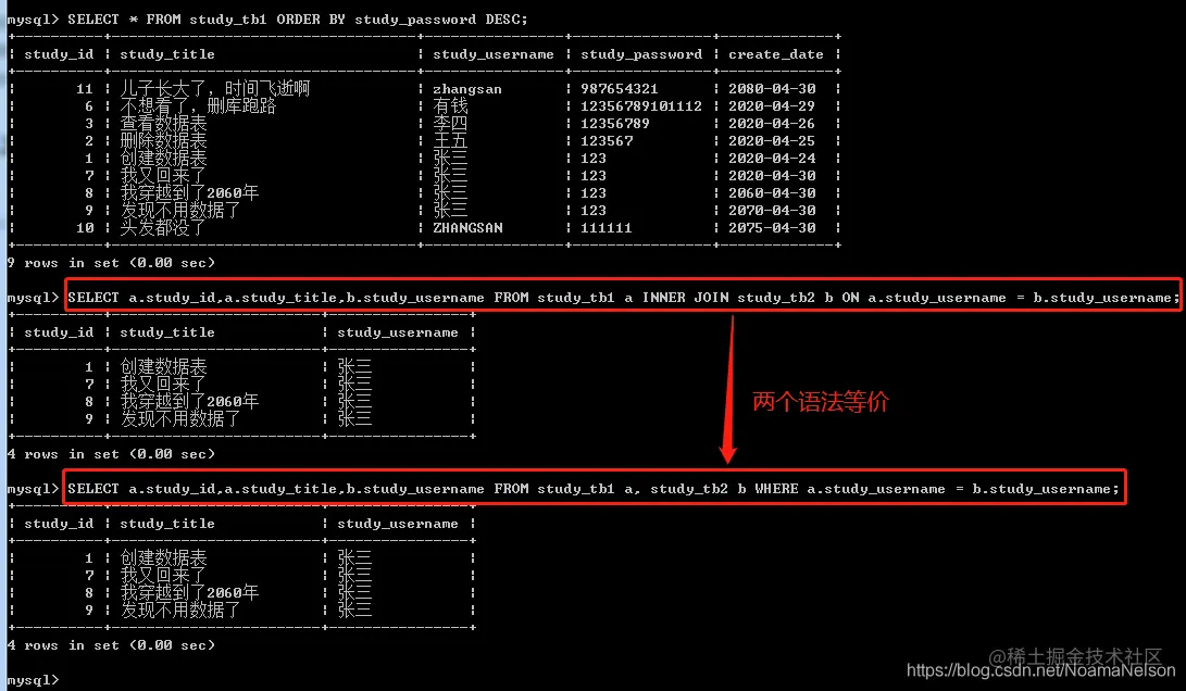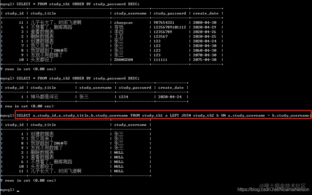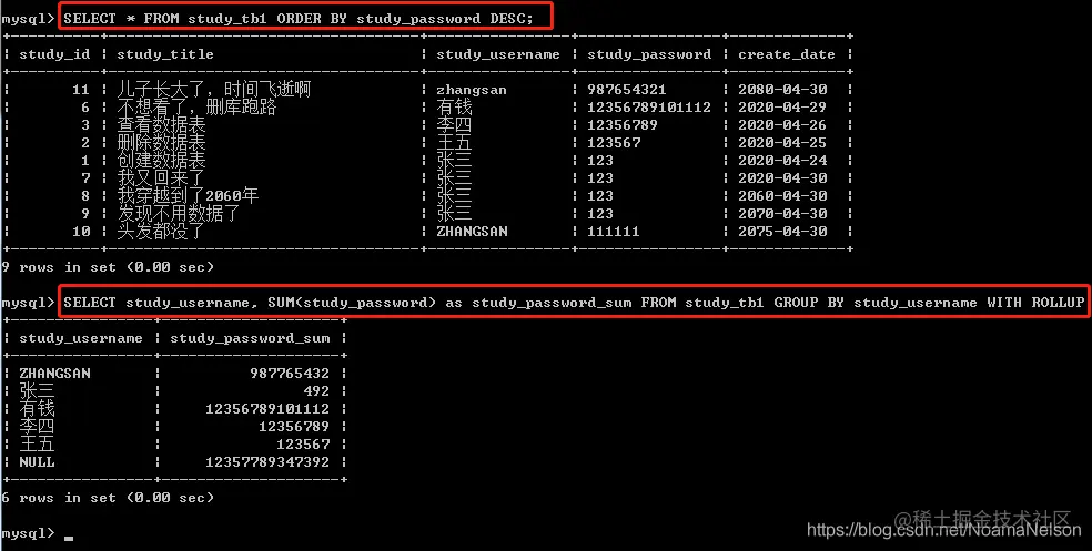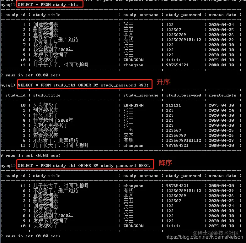 查找数据库 pymysql_study 的数据表 study_tb1 中 study_password 按升序和降序排序。