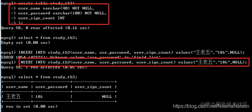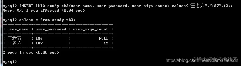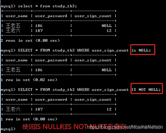 先新建一个数据表 study_tb3,然后新建一条某个字段数据为 NULL,再进行查找