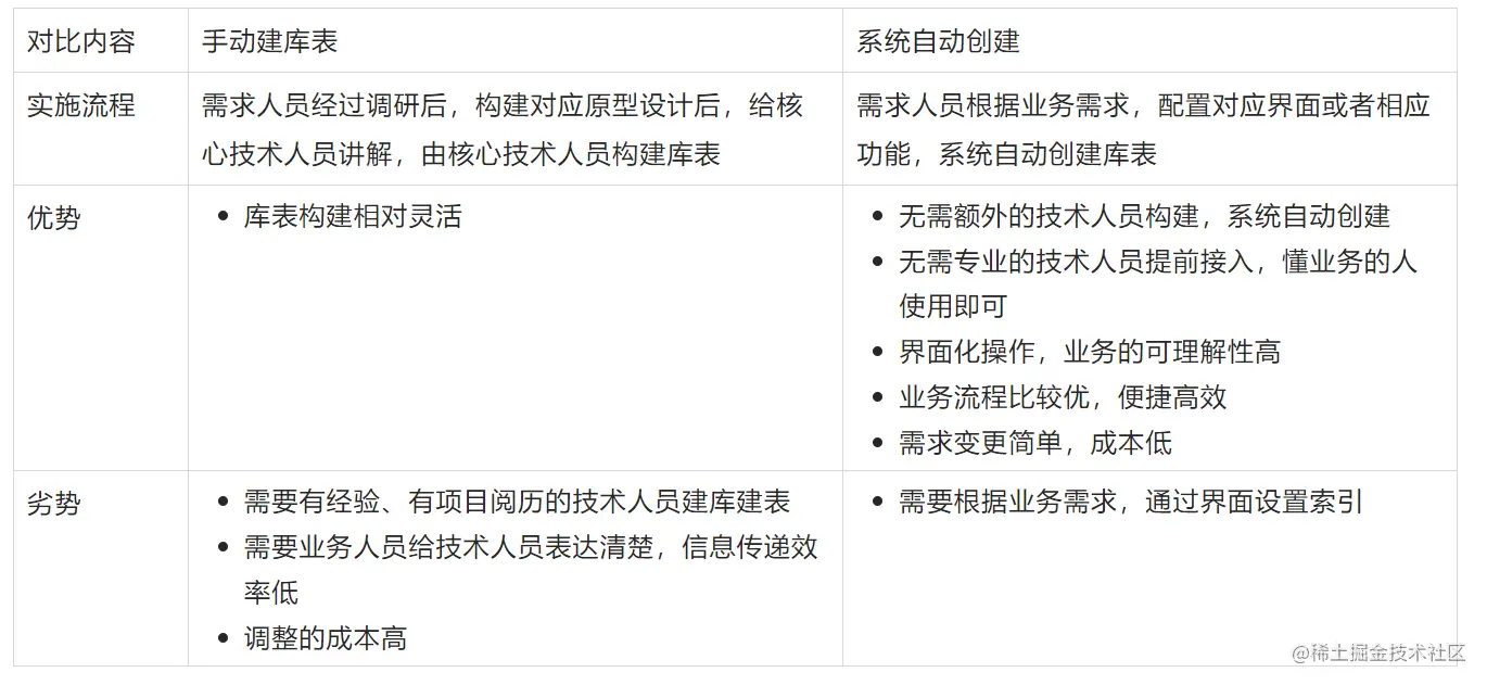 1、数据模型的定义:这个可能对不了解行业的人来讲有些复杂,也就是数据库表的构建模式。行业内大体两种模式,第一种通过人工的方式,构建数据库;第二种模式,系统根据页面自动创建数据库表,下面对比下两种模式之间的差异。