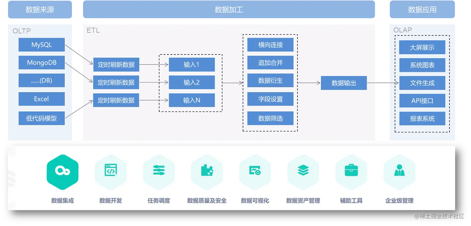 4.数据加工数据分析:能对接企业内多种数据源,对数据进行界面化的加工,屏蔽各种数据源的差异,让体系内的数据应用可以便捷使用: