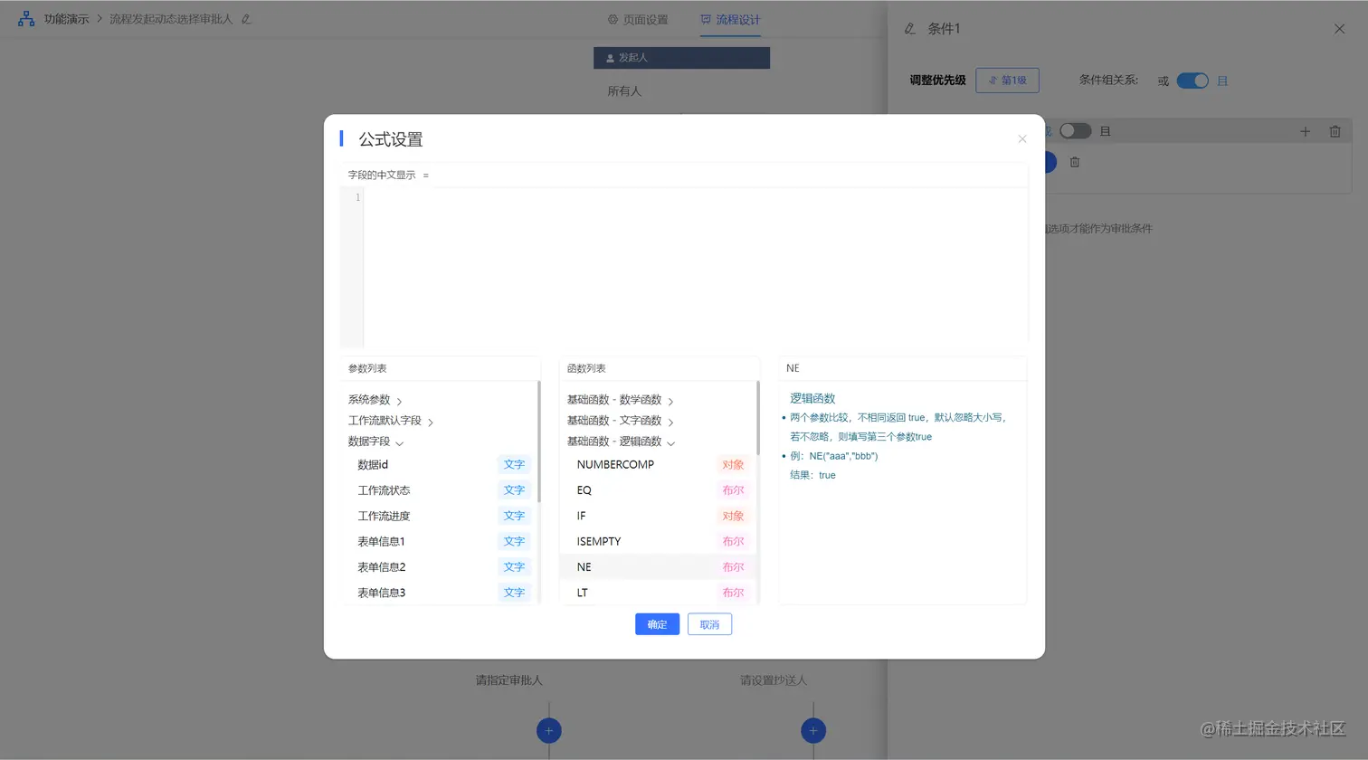 其中动态条件、动态业务设置可以通过系统提供的 可视化函数配置器、可视化逻辑引擎: