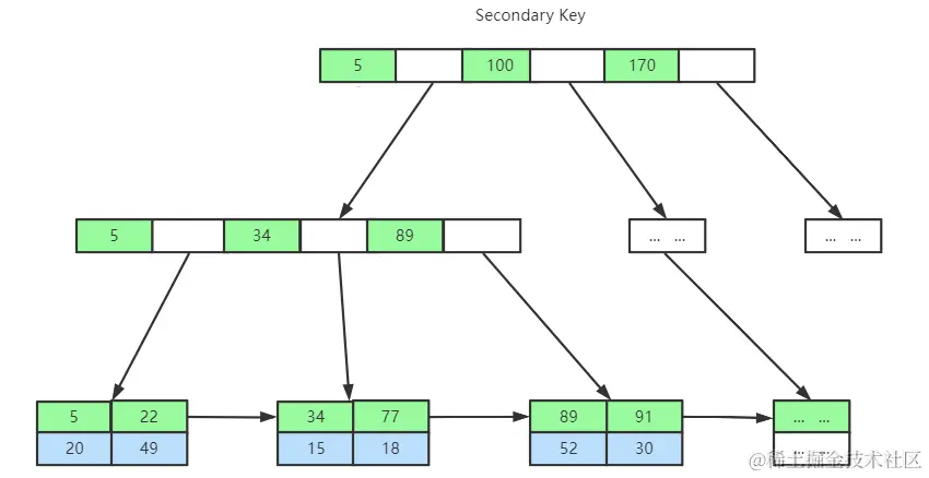 InnoDB 中索引文件和数据文件是同一个文件(聚集),并且主键索引和二级索引储存方式有所不同,如图所示,二级索引的叶子节点不储存数据,仅储存主键 ID。