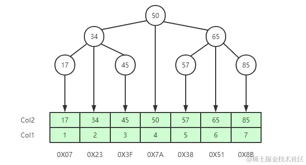 二叉树的特点:左边子节点的数据小于父节点数据,右边子节点的数据大于父节点数据。如下图所示,如果 col2 是索引,查找索引为 65 的行元素,只需要查找两次,就可以获取到行元素所在的磁盘指针地址。