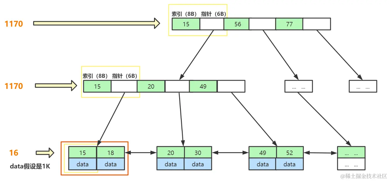 假如:B+Tree 的表都存满了。主键索引的类型为 BigInt,大小为 8B,指针存储了下个节点的文件地址,大小为 6B。最后一层,假如 存放的数据 data 为 1K 大小,那么