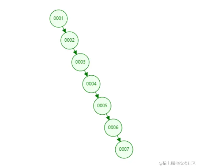 但如果是一个按照顺序递增的值,例如为 col1 建立索引,不再适合使用二叉树建立索引,因为此时使用二叉树建立索引将会变成一个链式索引,此时的索引结构如下图所示,如果查找 6 节点需要 6 次遍历才能找到。