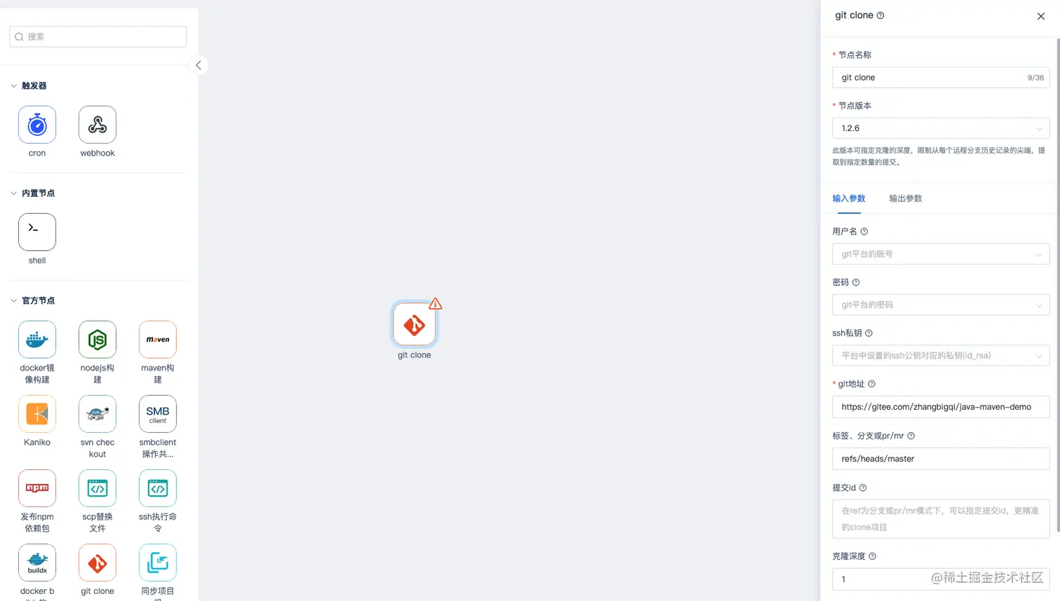 当然还有更高级的玩法,建木支持定义 Workflow,Workflow 支持节点并行、串行等等,但只能通过代码项目编辑 DSL 定义 Workflow。
