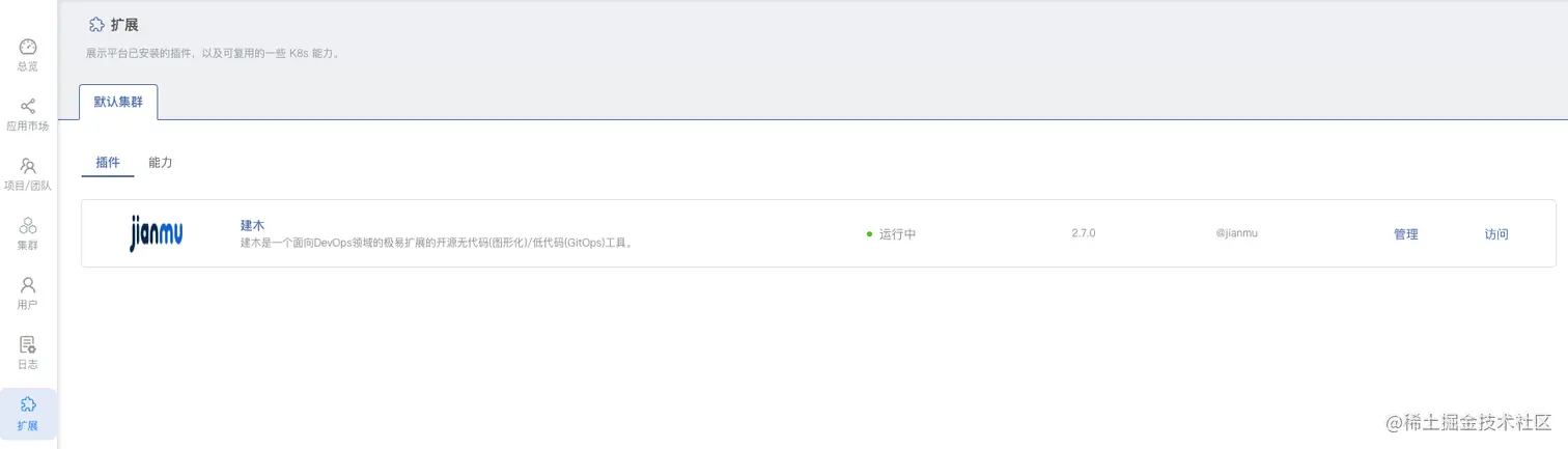 同时也可以在 平台管理 -> 扩展 -> 插件 中看到建木应用插件的定义。