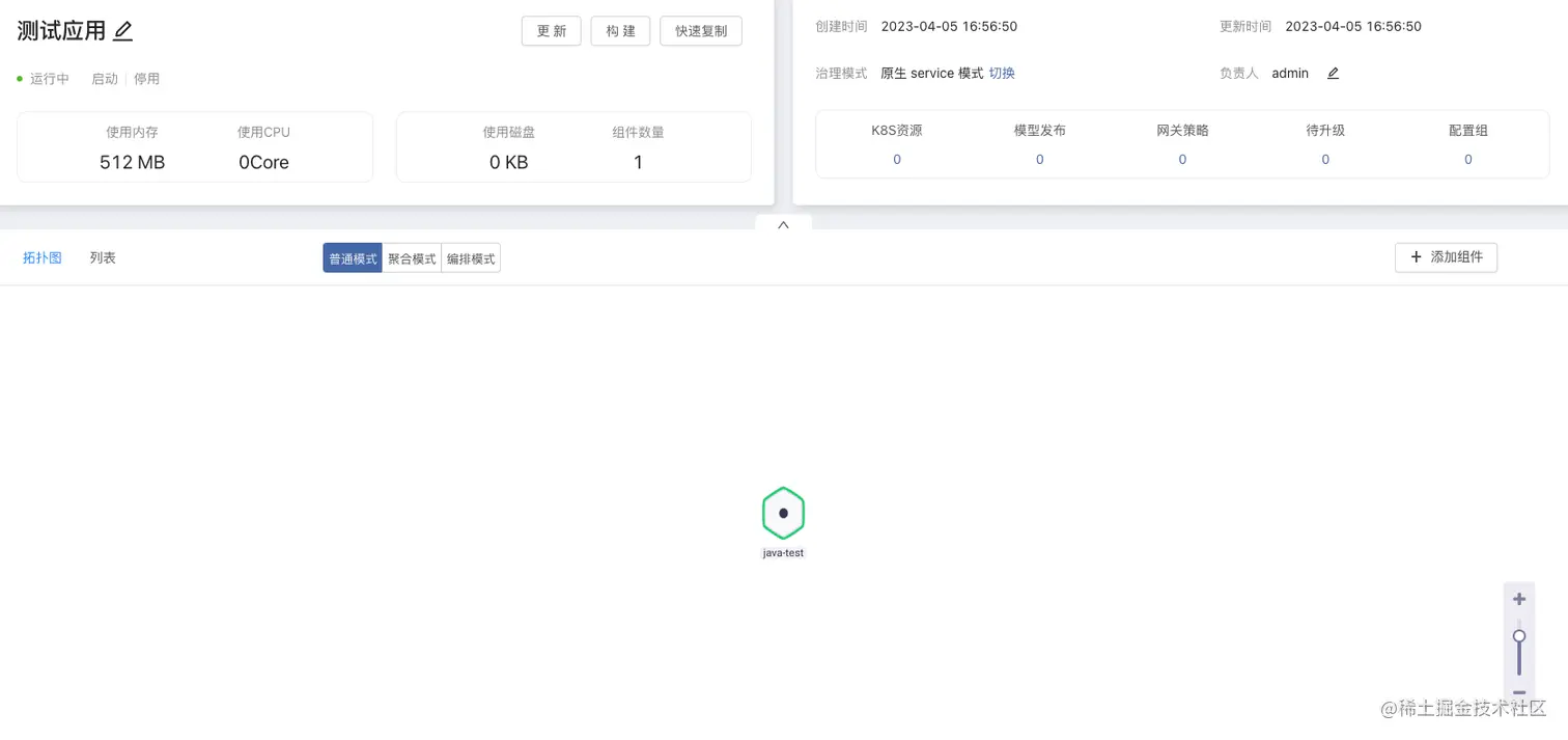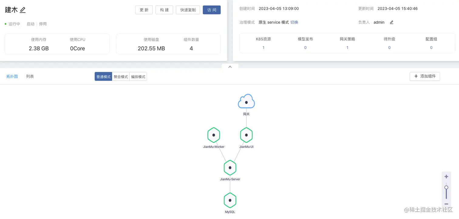 安装完成后,建木应用拓扑图如下,可通过 Rainbond 默认提供的域名访问建木 UI,默认用户密码 admin/123456