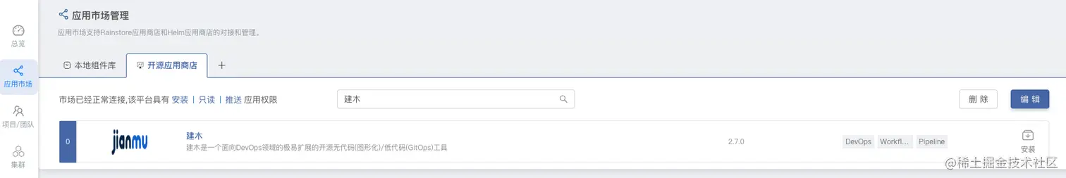 通过 Rainbond 开源应用商店一键安装建木应用,在 平台管理 -> 应用市场 -> 开源应用商店 中搜索 建木,进行安装。