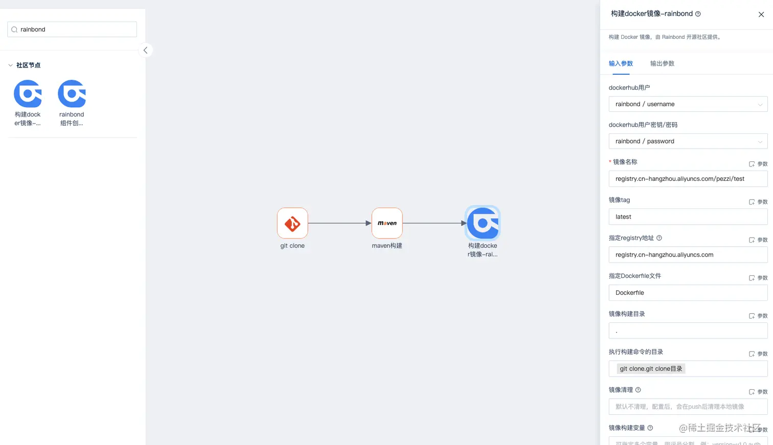 3.搜索 rainbond,添加 构建docker镜像-rainbond 节点,并配置。