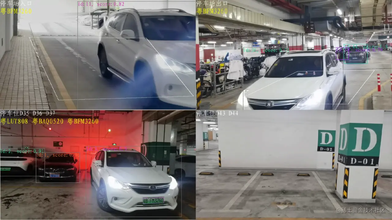 本案例我们使用FairMOT进行车辆检测与跟踪、yolov5进行车牌检测、crnn进行车牌识别,在停车场入口、出口、停车位对车辆进行跟踪与车牌识别,无论停车场路线多复杂,小车在你掌控之中!最终效果如下:
