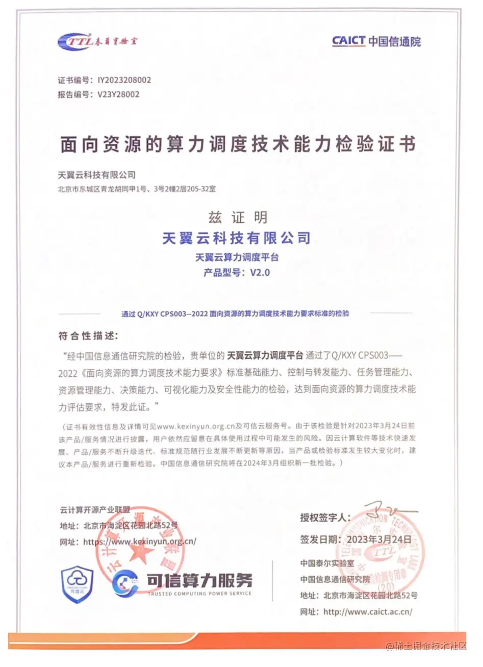 3月29日,2023企业上云暨算云融合产业大会在北京启幕。会上,中国信息通信研究院(以下简称“信通院”)揭晓了首批可信算力云服务评估结果,天翼云算力调度平台(“息壤”)顺利通过“面向资源的算力调度技术能力要求”评估,成为业内首批通过该项评估的云服务商。