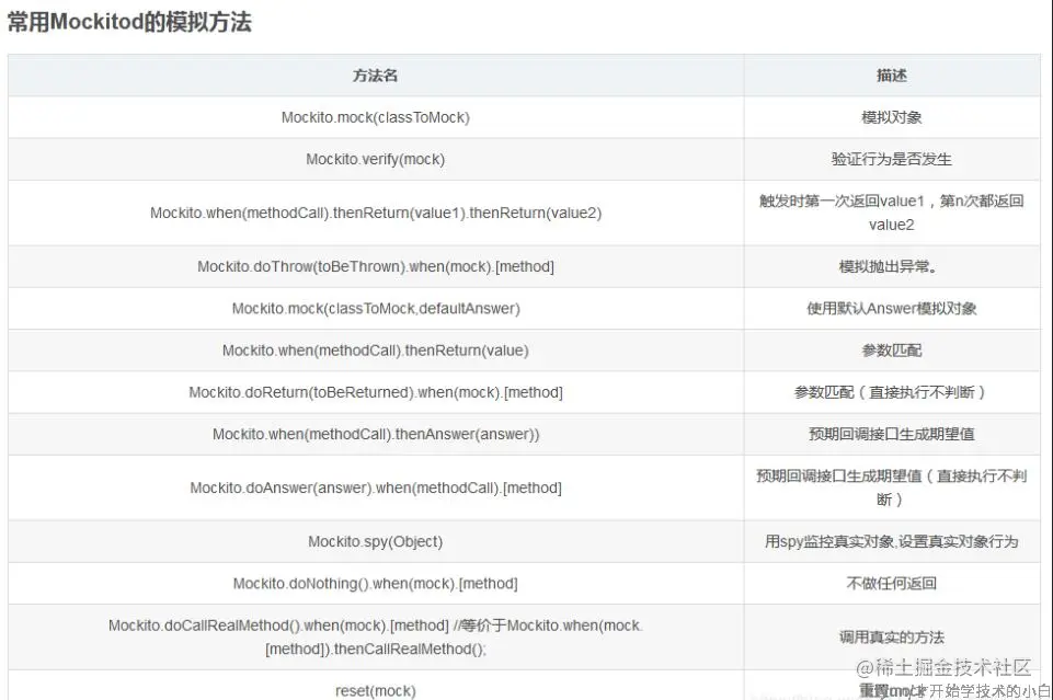 实际上Mockito库有很多方法可以供我们调用,即使是@Spy注入的类也可以使用,大家可以自行去查手册,或者参考下表: