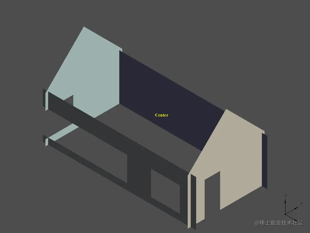 除了简单地获得墙壁的 3d 形状外,内部空间的中点是通过计算几何边界框的平均值来确定的。 稍后需要这个中间点来确定墙的哪一侧作为内部空间体积的基础。