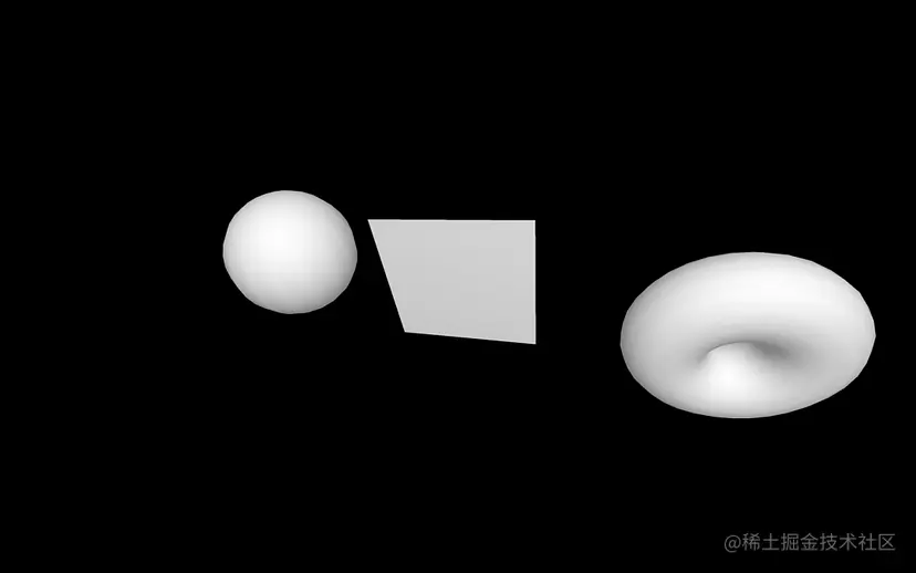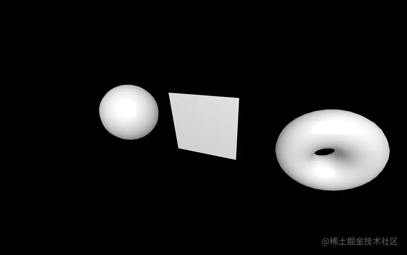 创建 3 个不同的几何体(球体、平面和环面)并在所有 3 个几何体上使用相同的 MeshBasicMaterial。给它们不同的 x 坐标以将它们分开。场景的 add(...) 方法也可以通过传递多个参数一次性将所有几何体添加到场景中: