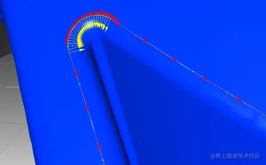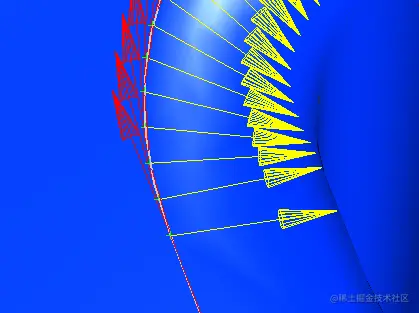 绿色十字:表示节点的 3D 点,红色箭头:表示该点处的切线向量,黄色箭头:表示该点处的二阶导数向量