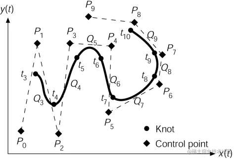 样条曲线是一种数学表示,可以很容易地为其构建一个界面,允许用户设计和控制复杂曲线和曲面的形状。 一般的方法是用户输入一系列点,然后构造一条曲线,其形状与该序列非常接近。 这些点称为控制点。 实际通过每个控制点的曲线称为插值曲线; 通过控制点附近但不一定通过控制点的曲线称为近似曲线。 一旦我们建立了这个界面,然后要改变曲线的形状,我们只需移动控制点。