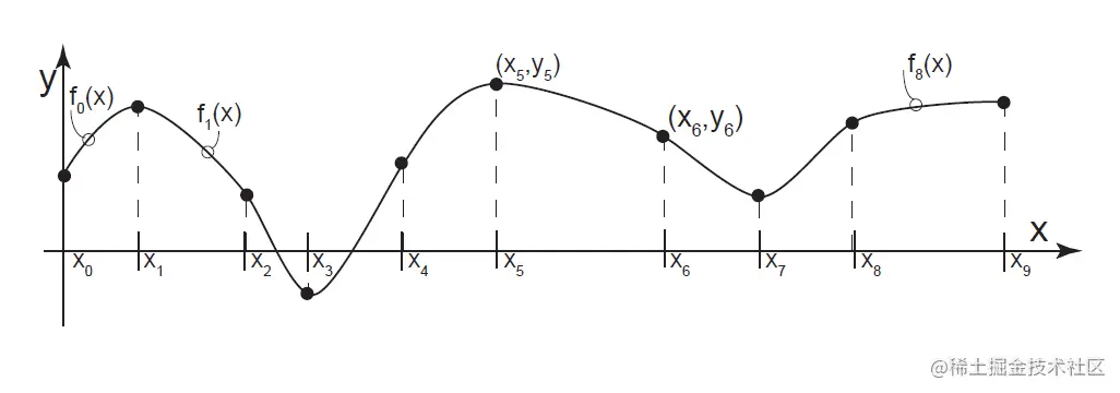 在此示例中,十个控制点的 x 坐标值递增,并用索引 0 到 9 进行编号。每个控制点对之间是一个函数,其编号与其最左边的点的索引相同。