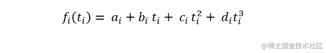 在示例中,两条曲线相同,但是描述它们的方程式不同。 在右侧的参数形式中,我们定义了参数 t0、t1 和 t2,当我们沿着 x 轴在控制点之间移动时,它们在 0 和 1 之间变化。 我们可以写方程: