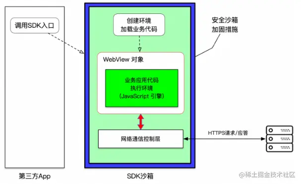 SDK 为业务代码提供⼀个封闭的安全沙箱,有效对抗外部代码的⼲扰和数据泄露⻛险;第三⽅ App 只能通过 SDK 暴露的接⼝启动 SDK,SDK 完全管控对业务代码所需要的运⾏环境以及业务代码所有对外通信,可以通过多种机制保证⽹络通信不被拦截和⼲扰;SDK 内部使⽤独⽴的浏览器内核,运⾏环境与系统浏览器完全隔离。